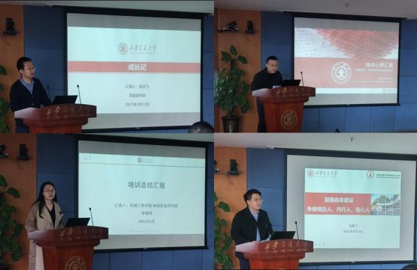 宣传部张云飞、钱学森学院杨潇、机械学院李瑞萍、马克主义学院岳鹏飞代表新任科级干部汇报学习情况,分享学习心得和工作体会。他们表示此次学习收获颇丰,对自身思想认识和工作实践都有很强的指导意义。四名新任干部表示将不忘初心、珍惜岗位,以更加奋进的姿态,更加主动的作为投入到学校管理服务中,不负组织赋予的责任和使命,为学校各项事业建设贡献更大力量。
