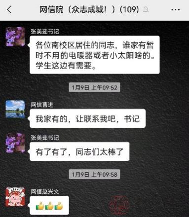 针对学生前期反馈的房间不太保暖的问题,学院与校医院及时协调,积极支持保障,李晖院长更是拿出自己家的被子给隔离区的同学应急。在疫情特殊时期,网信院全体师生守望相助,共克时艰,相信在我们共同努力下,定会打赢这场疫情防控攻坚战。