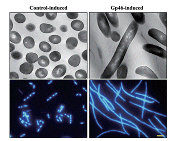 超级蛋白Gp46导致细菌体长无限变长,无法完成分裂进而死亡