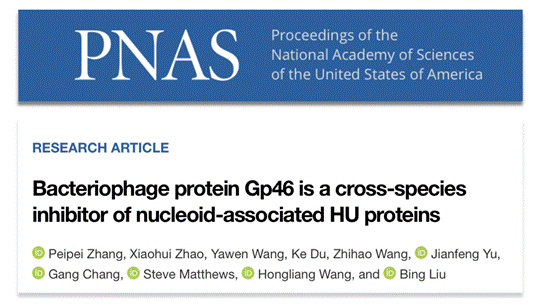 2月22日,上述研究成果在《美国国家科学院院刊》(PNAS)在线发表,论文题目为《噬菌体蛋白Gp46是一种横跨多物种的组蛋白抑制剂》(Bacteriophage protein Gp46 is a cross-species inhibitor of nucleoid-associated HU proteins)。该研究是刘冰团队自2021年10月在《核酸研究》(Nucleic Acids Research)发表全新抑菌机制研究成果后的又一重要研究成果。