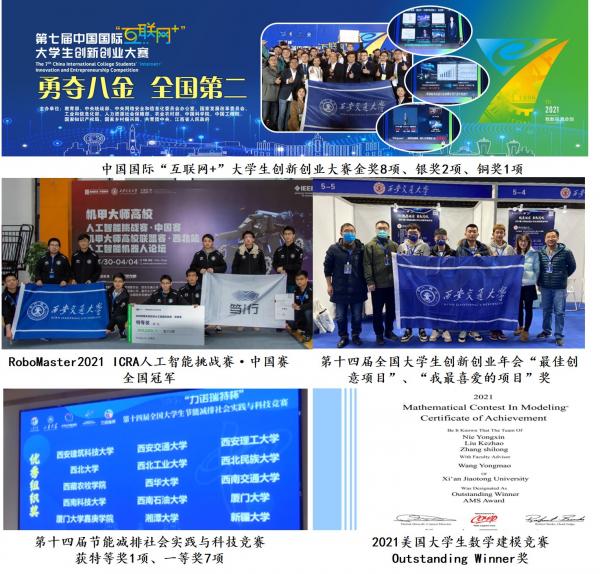 西安交大已形成以校级、省级、国家级三级创新训练项目及重点、一般校院两级资助的三级学科竞赛为载体的分层次、结构化的创新能力培养体系,组织开展中国国际“互联网+”大学生创新创业大赛、挑战杯等20余项竞赛项目。2021年各类竞赛中屡获佳绩,特别是中国国际“互联网+”大学生创新创业大赛获得金奖8项,金奖获奖数再创历史新高;挑战杯”全国大学生课外学术科技作品竞赛黑科技专项赛获特等奖2项、一等奖3项,居全国前列;RoboMaster 2021 ICRA人工智能挑战赛·中国赛斩获全国冠军,第十四届节能减排社会实践与科技竞赛获特等奖1项、一等奖7项,近10年最佳。