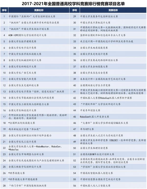 2017年以来,全国普通高校学科竞赛排行榜每年发布一次,该榜单是我国第一个专注高校创新人才培养暨学科竞赛成果的排行榜。