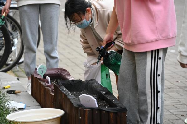 下午15:30,竹园1、2号下十分热闹,80余位同学带着前一天浸泡完成的种子早早在楼下等候,参与同学被分为8组负责宿舍楼间的8组花坛。