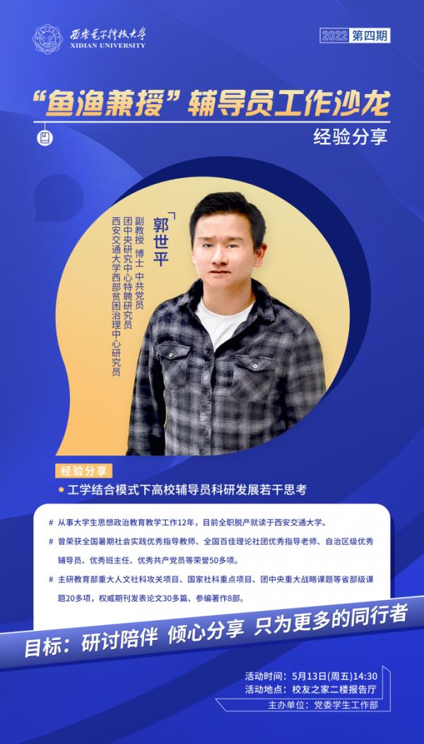 5月13日,由党委学生工作部主办的“鱼渔兼授”辅导员工作沙龙第四期在校友之家二楼报告厅举行。西安交通大学郭世平副教授以《工学结合模式下辅导员科研发展若干思考》为题作经验分享。