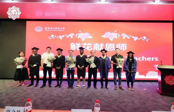 毕业生们向参加授位仪式的导师及各学院老师代表献花,表达对师长辛勤培育的感恩之情。培养学院领导及老师为优秀国际学生毕业生颁发了获奖证书。