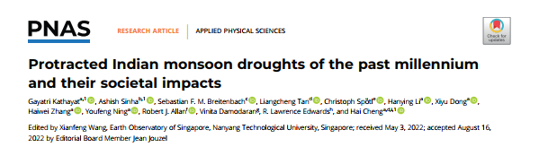 加州州立大学多明格斯山分校Ashish Sinha教授指出:“我们的研究表明,持续至少3年或更长时间的干旱事件往往会在数十年的较弱季风降雨期内发生。这些较弱的季风期之间是长达数百年的相对稳定的气候期——这就如同过去150年器测记录揭示的较为稳定的气候一样,基本上没有发生类似于文献资料记载的长期干旱。”在最近150年的器测记录时期缺少连续多年的极弱季风事件可能会让人产生一种错误的安逸感,误以为长期的干旱事件并不是印度季风变化的内在特征。不幸的是,这种观点目前是印度地区的水资源基础设施政策的依据。Kathayat副教授指出:“如果这种长期干旱在未来再次发生,将产生重大社会和政治影响,除非该地区的水资源基础设施和应急计划充分考虑了长期的季风变率。”