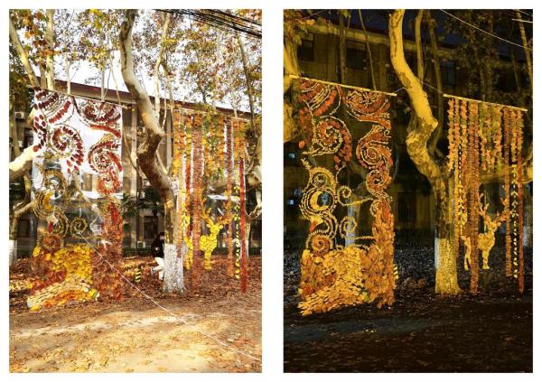 “城市公共艺术”课程充分尊重同学们自主创意。早在几周前,任课老师就提醒同学们关注梧桐节,引导同学们以艺术的视角去观察秋叶、感悟秋天,并开始征集初始创意。在提交的120份创意文稿中,老师们遴选了其中12个艺术创意方式,通过分析梧桐节会场空间特征和实施技术条件,给出优化意见,最终由同学们票选、决定共同实施2个方案。