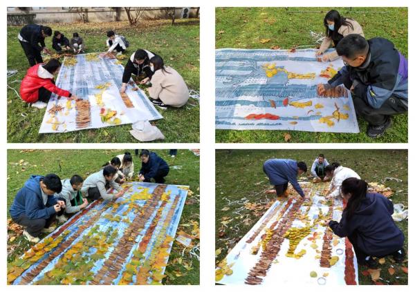 本次艺术实践得到了党委宣传部、教务处和艺术系师生的大力支持。课程鼓励、开发同学们的艺术创造力。老师与助教带队在校园寻找合适的叶色、叶形,学生利用课余时间分批次制作,在欢声笑语中共度金秋快乐时光。特别是在实践过程中,学生们“因叶、因色、因地制宜”,不断提出新的创意,大胆地进行二次艺术创作,为作品增加了不少趣味和互动氛围。因秋叶颜色存续时间短,师生抓紧时间制作,现场解决安装难题,历时3天终于完成了全部艺术实践,一起享受着拥抱自然秋景、沉浸艺术创作带来的轻松与快乐。