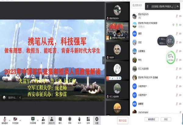 12月15日19:30至21:30,西安电子科技大学征兵工作站、就业指导服务中心邀请火箭军工程大学、空军工程大学人力资源部门鲁干事、杨干事、庞老师,西安市征兵办朱参谋通过腾讯会议视频系统在线为300余名2023届毕业生(本科、研究生)解答了军事院校招录招聘直招军官和文职政策,对招收人员的学历、年龄、身体要求进行说明,从网上报名、资格审查、考察面试、上报审批等程序等进行讲解,在线回答了学生提问。