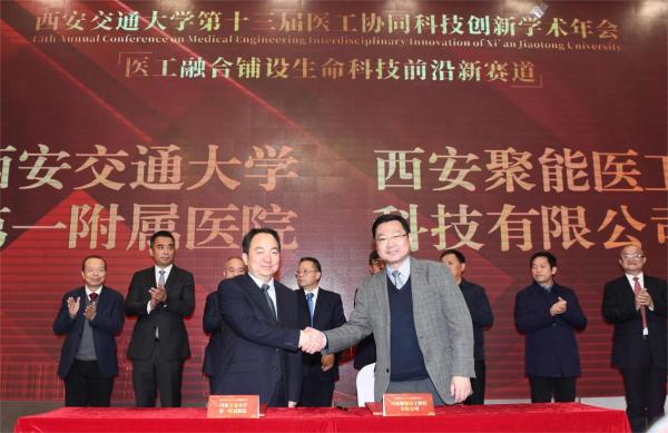 1月13日下午,在第十三届医工协同科技创新学术年会上,西安交通大学第一附属医院代表学校与联影医疗技术集团有限公司、西安聚能医工科技有限公司签署共建国家医学中心合作协议,将进一步推动大跨度学科交叉融合,开启国产医药和医疗装备研发的发展新赛道,共同助力国家医学中心建设。