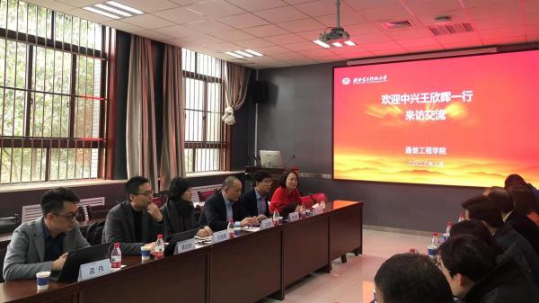 2月17日下午,中兴通讯副总裁王欣晖一行前来西安电子科技大学通信工程学院调研交流,就2022年9月8日西电与中兴通讯双方领导关于ICT行业标准化人才校企联合培养的合作意向进行落实。学院教学副院长顾华玺、李晓辉教授、刘刚教授、办公室主任李靖及本科教学相关人员参加本次会议。