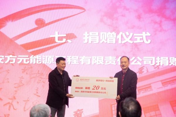 会上,学校教育基金会秘书长、校友事务与联络发展处处长肖刚代表学校接受西安方元能源工程有限责任公司向物理学院20万元的捐赠。副校长张进成和物理学院副院长魏兵共同为“量子信息物理研究所”揭牌。