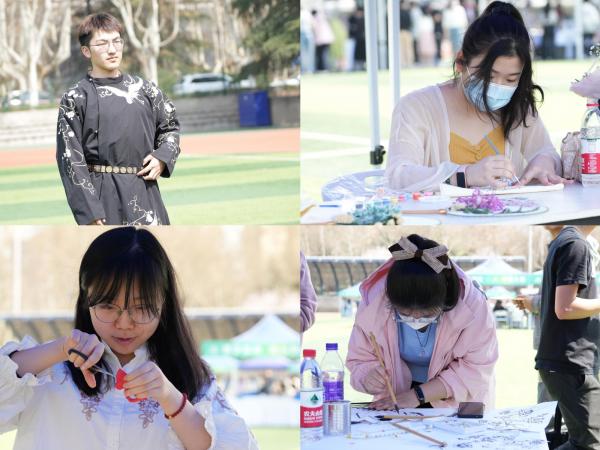 而华服体验只是其中的一个项目,“仲春大集”围绕传统文化巧思妙想地精心设置了传统非遗主题体验街区,同学们不仅可以自己动手编绳结、绘灯笼、做香囊,还能创作剪纸作品、绘制折扇扇面、制作干花团扇,体验一把传统非遗与现代生活的碰撞。