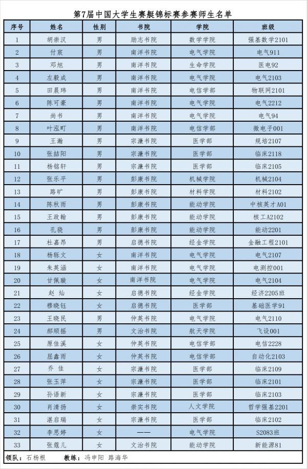 5月11日至14日,第7届中国大学生赛艇锦标赛暨第31届世界大学生夏季运动会赛艇项目选拔赛在辽宁沈阳浑河举行。西安交通大学学生赛艇队在赛事中获得四金三银一铜的优异成绩,获得金牌数和奖牌数均居全国首位。来自崇实书院人文学院哲2201班的肖清扬同学成功入选第31届世界大学生夏季运动会国家队候选名单。