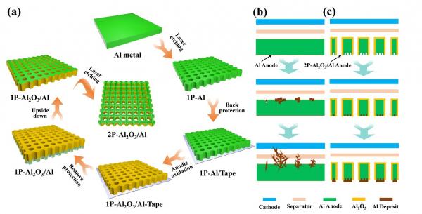 针对这一问题,西安交大化学学院杜显锋教授团队提出了一种底部生长模式的铝电池阳极结构(2P-Al2O3/Al阳极),它可以提供反向电场强度(Ebottom>Etop)来诱导Al的定向沉积。即使在大面积容量的情况下,也可以形成稳定的电极-电解质界面。与传统的平面Al相比,2P-Al2O3/Al阳极重新分布了电极的电场,诱导Al优先沉积在电极的底部,增加了隔膜和沉积物之间的安全距离,同时大的比表面积丰富了Al的成核位点,有助于降低成核势垒,另外,3D电极结构减轻了Al沉积过程中的电极膨胀问题。2P-Al2O3/Al阳极具有更稳定的电极-电解质界面和更长的循环寿命。即使在5 mAh·cm-2的大面积比容量下,它仍然可以连续工作1200小时以上,是平面铝阳极的6倍多。该策略和方法对于组装具有高能量密度和高循环稳定性的铝电池具有重要的现实意义。