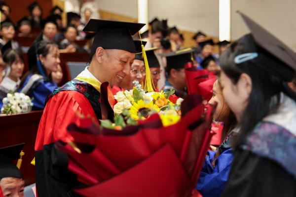 唐欣琳同学和申金顺同学分别作为2023届的本科生代表和研究生代表,向学校、学院以及所有老师致以衷心的感谢。唐欣琳表示,数学这门严谨的学科带给了她严谨的思维逻辑,这门简化而复杂的学科非常伟大,感谢学校提供的平台以及学院的悉心栽培。申金顺则说:“我们生在国旗下,长在春风里,吾辈当自强!希望大家前程似锦,鹏程万里!”在表达感谢后,毕业生为老师们献上了鲜花与祝福。