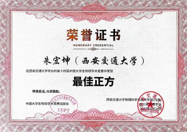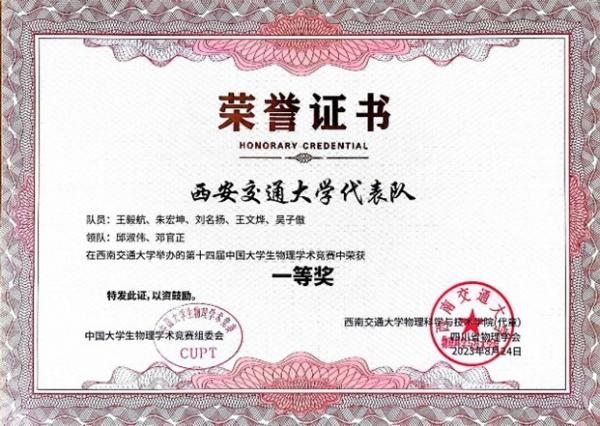 近日,第十四届中国大学生物理学术竞赛(China Undergraduate Physics Tournament,简称CUPT)由西南交通大学的组织下举行,来自全国各地63所高校的64支代表队的学子们开展了精彩的交流与竞争。经过4天5轮的高强度的激烈角逐,西安交通大学代表队获大赛全国一等奖,再创佳绩。同时,队员朱宏坤同学获得了最佳正方奖。