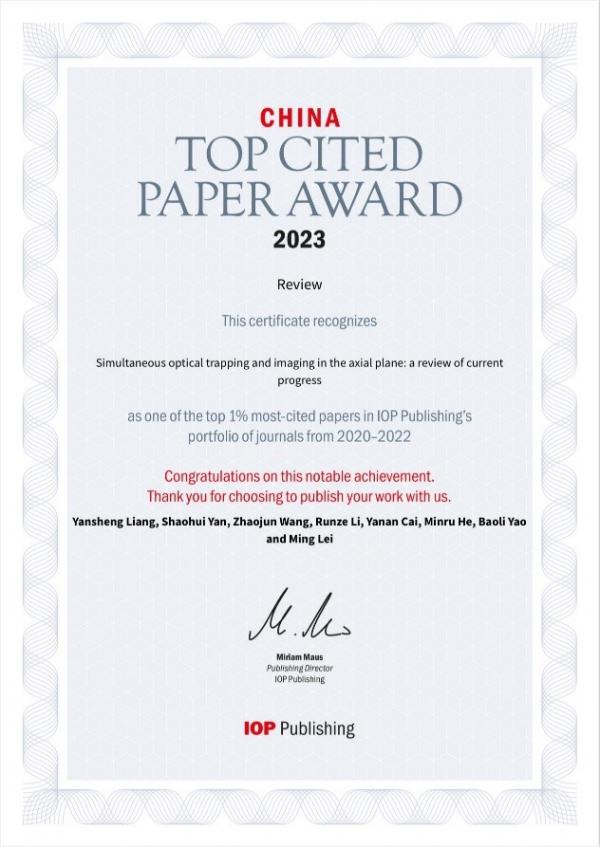 近期,英国物理学会出版社(IOP Publishing)公布2023年“中国高被引文章奖”获奖名单,以表彰中国研究人员在全球科学界的影响力以及他们对物理学的贡献。西安交大物理学院雷铭教授团队在Reports on Progress in Physics(IF=18.1)的综述论文“轴平面同时光学捕获与成像”(Simultaneous optical trapping and imaging in the axial plane: a review of current progress)获得IOP Publishing的前1%高被引荣誉。西安交通大学物理学院为论文第一通讯单位,第一作者是西安交通大学物理学院梁言生副教授,共同第一作者是中国科学院西安光学精密机械研究所严绍辉研究员,通讯作者是西安交大物理学院雷铭教授(lead contact)和中国科学院西安光学精密机械研究所姚保利研究员。