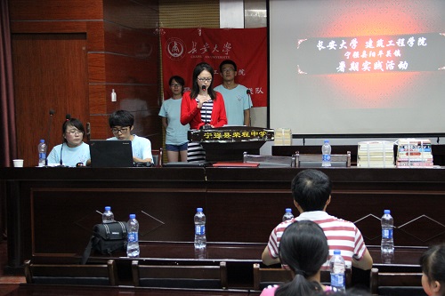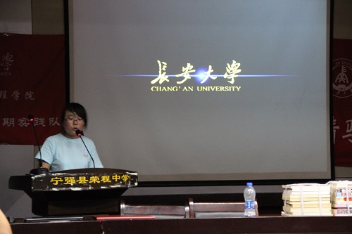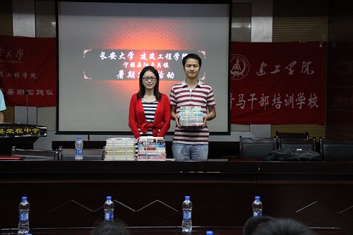 下午四点,暑期社会实践队的队员们就到达了荣程二中,布置我们所占用的会议室,贴横幅,贴队旗,试音响设备、投影仪设备…队员们忙地不亦乐乎。下午5:40,队员们站在自己的指定地点,准备到时为当地居民引路。6:00,当地居民陆续到达荣程二中。6:30,活动正式开始。朱文婕老师上台讲话,她说:“感谢当地政府和荣程中学对我们本次的暑期实践活动的大力支持,感谢当地居民的热心参与。我们暑期社会实践队将为荣程二中捐献图书30本,希望这里的孩子能够好好学习。”随后,荣程中学老师代表上台接受赠书。接下来,我们为大家播放长安大学宣传片和防震减灾安全知识宣传片。由于阳平关镇靠近四川,所以地震发生比较频繁,所以知道些防震减灾的科普知识对这里的居民非常有好处。最后,我们为大家播放励志电影《中国合伙人》,希望借此电影的精神向大家传递一种乐观向上的生活态度。