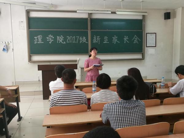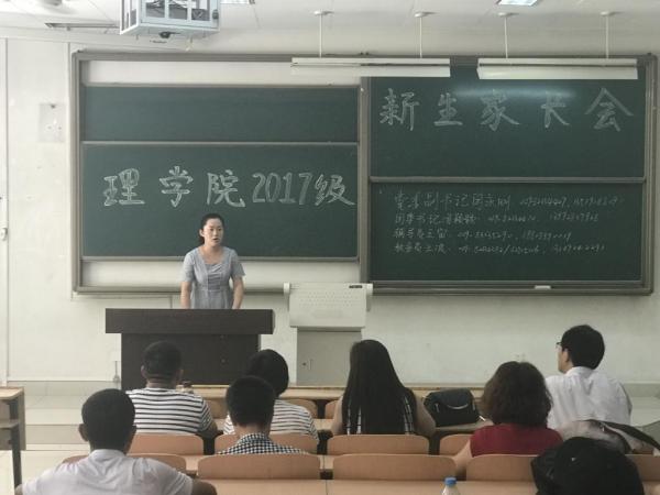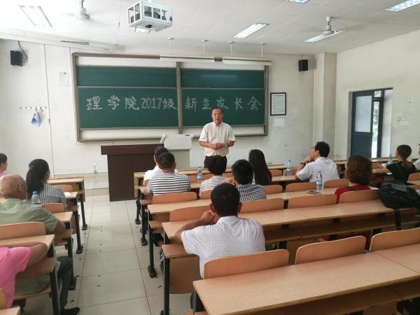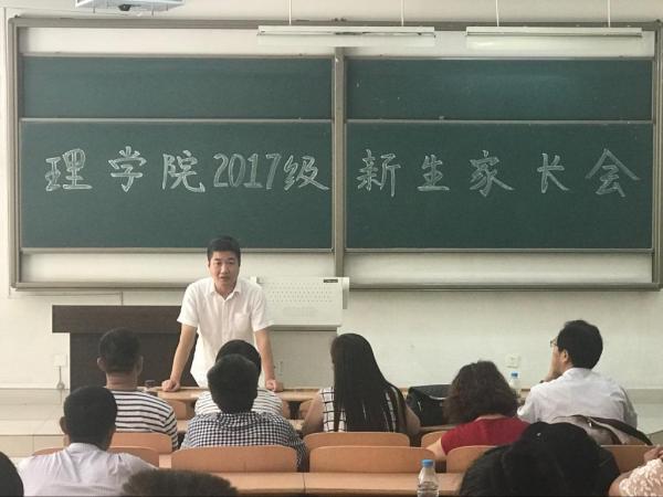 2017年8月24日10:00,理学院在明远1105教室举行2017级新生家长会,院党委书记姜洪、党委副书记闫永刚、副院长商泽进、辅导员王宙、17级力学班主任袁振圣出席了会仪,党委副书记闫永刚主持会议。
