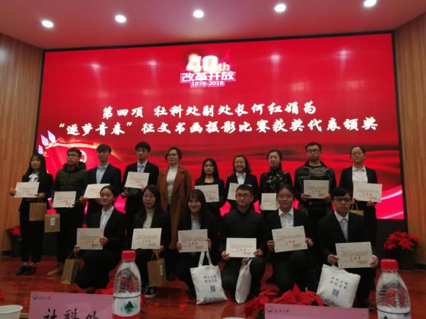 社科处副处长何红娟老师为“逐梦青春”征文书画摄影比赛获奖代表颁奖