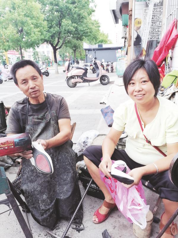 刘成柱全身僵硬,头不能摆动,仅靠可以转动的眼珠和能活动的手腕手指开摊接活。李玉兰操动着仅剩两指的左手,握剪操针、纳线粘胶。他们俩就这样把一双双裂口、脱胶、掉底、断根的鞋子,迅速补得又牢又稳,平顺稳妥,得到顾客一声声惊喜的夸赞。