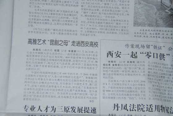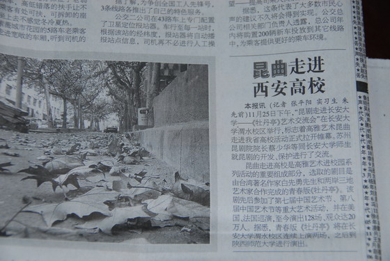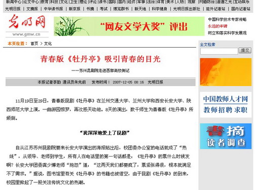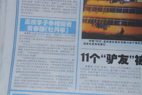 12月5日,《光明日报》在二版显要位置以我校为代表刊登了昆剧青春版《牡丹亭》走进西部高校的盛况,该消息一经发表,被国内各大网站纷纷转载:人民网、新华网、中国新闻网、中国台湾网、中国教育网等纷纷转载了此消息,在两岸三地和国外都引起了强烈反响,掀起了一股年轻人追崇中国古典文化的高潮。昆剧青春版《牡丹亭》在我校演出时还受到了省市各大媒体的高度重视。《陕西日报》、陕西卫视《新闻联播》节目和《都市快报》节目、《华商报》、《西安晚报》、《西安日报》、西安电视台《西安零距离》节目等都对其进行了报道,经国内各知名网站转载,在省内外引起了强烈反响。