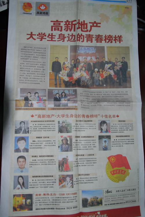 此次荣获 “高新地产•大学生身边的青春榜样”称号的是:用爱心和汗水为聋哑学校的孩子们撑起一片蓝天的渭南师范学院蒙古族学生吴垠;政治坚定、成绩优异、善于组织管理的优秀学生干部西安建筑科技大学学生会主席安坤;创新能力强、科研成果丰硕、发表16篇重要论文、担任多家国际著名期刊审稿人的西北工业大学博士研究生杜红亮;勇挑家庭重担,带着姐姐上学,与残疾姐姐共同成才的西北农林科技大学学生秦燕;笑对人生,勇斗病魔,用青春创造生命奇迹的我校研究生李欢;双脚踏平崎岖道路,信念舞动隐形翅膀,坚强谱写青春华章的西安欧亚学院无手女大学生李智华;在创业路上永不言弃、愈行愈勇的西安交通大学思缘创业团队队长孙志强;用文化和责任阐释美的使者、2007“中华小姐环球大赛”总冠军、西安外国语大学“形象大使”曾光;用辛勤的汗水换来大学一切开销、“唐文治特别优秀研究生奖学金”的获得者,从广西百色革命老区走出的优秀学子西安交通大学博士研究生黄建山;家境艰难、生活清苦,却不为巨款所动的拾金不昧好青年培华学院学生章力。