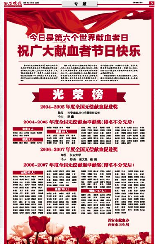 西安晚报报道我校荣获“2006—2007年度全国无偿献血促进奖”