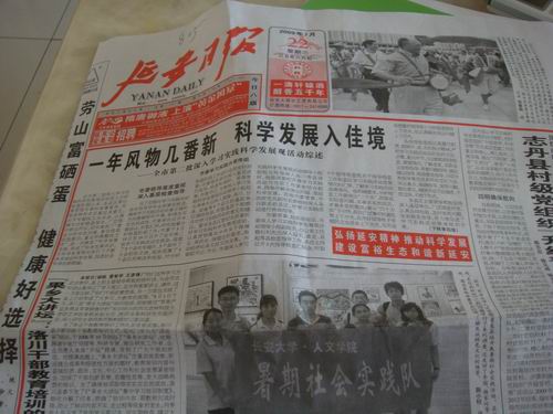 在实践期间,同学们围绕实践主题——基层文化,针对当地的红色文化、民俗文化以及农村文化展开了深入的调查,先后参观学习了枣园、王家坪等延安革命圣地,安塞县文化馆,并深入到侯沟门村进行调研,详细了解了红色文化、民俗文化的继承与发展情况,以及农村文化建设的开展状况,同学们的活动得到当地有关部门的大力支持和广大农民的热烈欢迎,并被延安农业信息网进行报道。