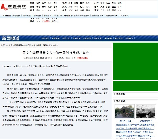 着眼于提高大学生科技创新与创业能力,以营造校园良好科技氛围为工作中心,以各类科技创新与创业活动为载体的科技节,是在校团委指导下,由大学生科技创新与创业协会承办的长安大学重要科技类精品活动之一。2010年11月,长安大学第十届科技节正式拉开帷幕。西安在线三秦网头版为此作了专题报道,预祝我校第十届科技节圆满成功。