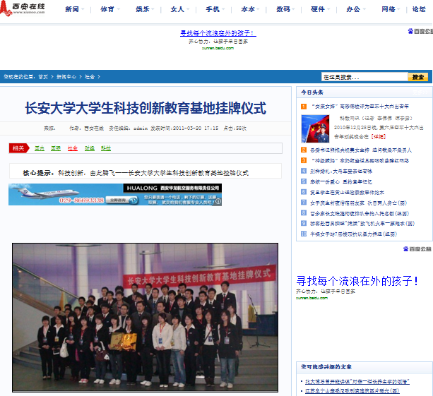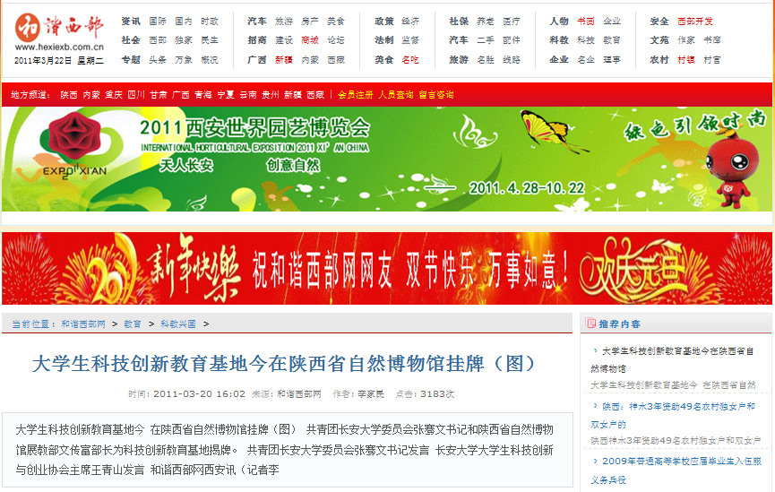2011年3月20日上午十点,我校与陕西省自然博物馆合作建立的“长安大学大学生科技创新教育基地” 揭牌仪式,在陕西省自然博物馆报告厅隆重举行。出席挂牌仪式的有陕西省自然博物馆展教部部长文传富、我校校团委书记张骞文老师、校团委姬国斌老师和长安大学大学生科技创新与创业协会学生干部来到陕西省自然博物馆。