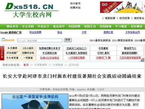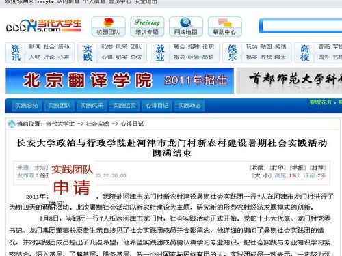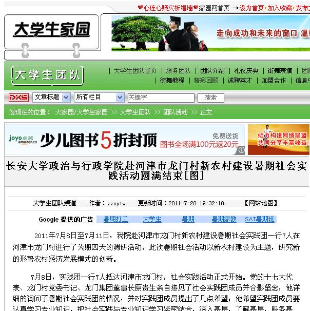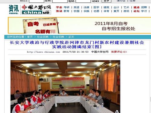 学院赴河津市龙门村新农村建设暑期社会实践团一行7人在河津市龙门村进行了为期四天的调研活动。本次暑期社会实践活动以新农村建设为主题,研究新的形势农村经济发展模式的创新。此次暑期社会实践活动在院党委副书记田猛老师和院团委书记汪治国老师指导下,龙门村党委、村委的大力支持下,社会实践团全体成员共同努力下取得了圆满成功。特别是本次实践活动受到了河津市电视台、中国大学生网、当代大学生网、大学生校内网、大学生家园网等多家媒体的报道,扩大了暑期社会实践活动的影响力。