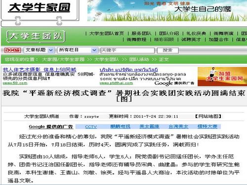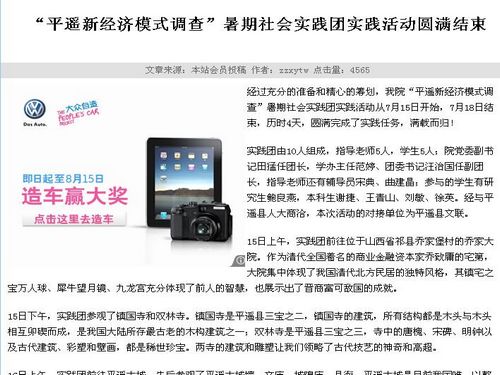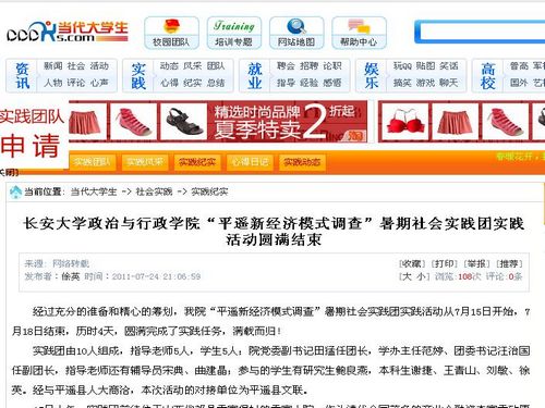 经过充分的准备和精心的筹划,我院“平遥新经济模式调查”暑期社会实践团实践活动从7月15日开始,7月18日结束,历时4天,圆满完成了实践任务,满载而归。特别是本次暑期社会实践活动受到中国学生网、中国大学生网、当代大学生网,大学生校内网、大学生家园网等多家媒体报道,扩大了本次活动的影响力。