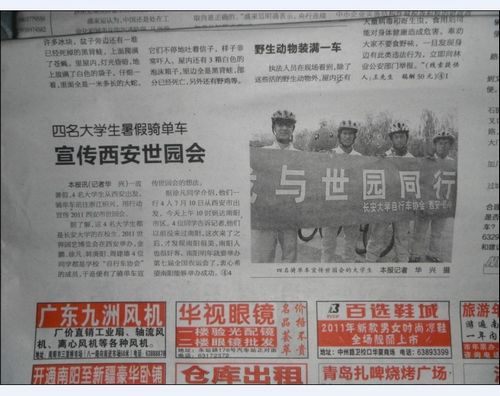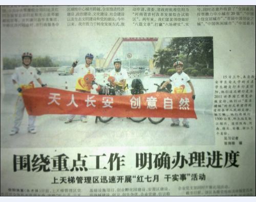7月10日,长安大学自行车协会4名同学从西安出发,骑行1600多公里,历经16天,最终到达目的地浙江绍兴,沿途宣传今年在西安举行的世界园艺博览会,并宣传低碳环保的理念。该活动得到了多家媒体的报道,以下是相关媒体报道资料: