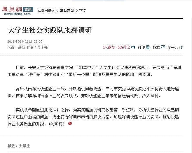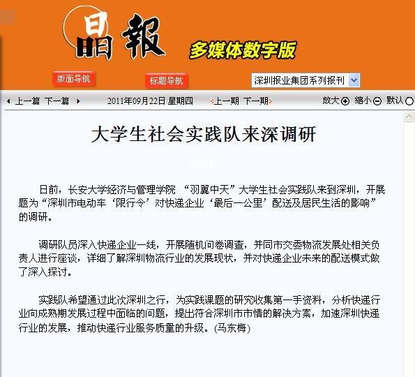 2011年8月13日至2011年8月23日,长安大学经济与管理学院“羽翼中天”城市物流实践队赴深圳市开展主题为“深圳市电动车‘限行令’对快递企业‘最后一公里’配送及居民生活的影响”的调研。本次暑期社会实践活动由学办王翀老师带队,一行7人在深圳市开展了为期10天的调研活动。