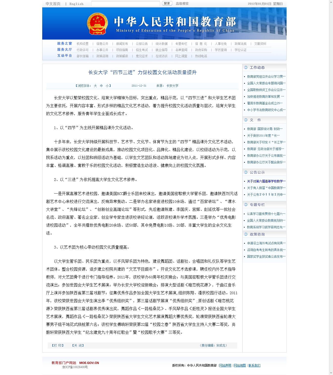 “长安大学“四节三进”力促校园文化活动质量提升”教育部门户网站报道截图