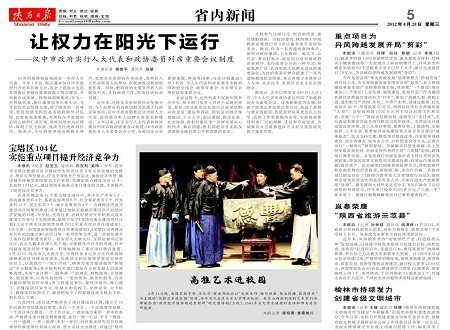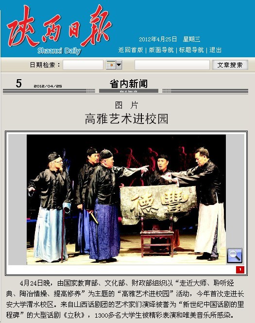 为进一步引领青年学生提高审美修养,提升精神境界,优化艺术教育环境,建设“向真、向善、向美、向上”的校园文化,我校积极响应教育部、文化部、财政部《于开展高雅艺术进校园活动的指导意见》的文件精神,将高雅艺术进校园活动作为提升我校大学生文化艺术修养的主要依托,并邀请山西省话剧院于2012年4月24日、25日在我校朝晖大学生活动中心一楼大礼堂举行大型话剧《立秋》的专场演出。《陕西日报》对我校此次活动进行了大力报道,反映了我校校园文化活动的巨大影响力,在宣传本次活动的同时,也促使我们再接再厉,不断提高校园文化的质量与层次,全面服务青年学生成长成才。