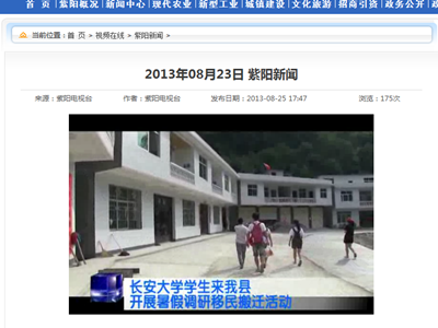 8月23日,《紫阳新闻》报道了我院大志团暑期社会实践团队赴陕南对安康市紫阳县移民搬迁综合现状进行调研的活动。
