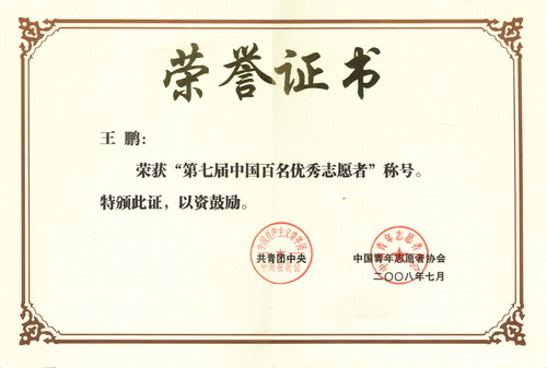 近日从团中央传来好消息,根据中青发[2008]20号文件《共青团中央关于表彰第七届中国十大杰出志愿者、中国十大杰出志愿服务集体等先进个人和集体的决定》,我校王鹏同学荣获“中国百名优秀志愿者”称号。