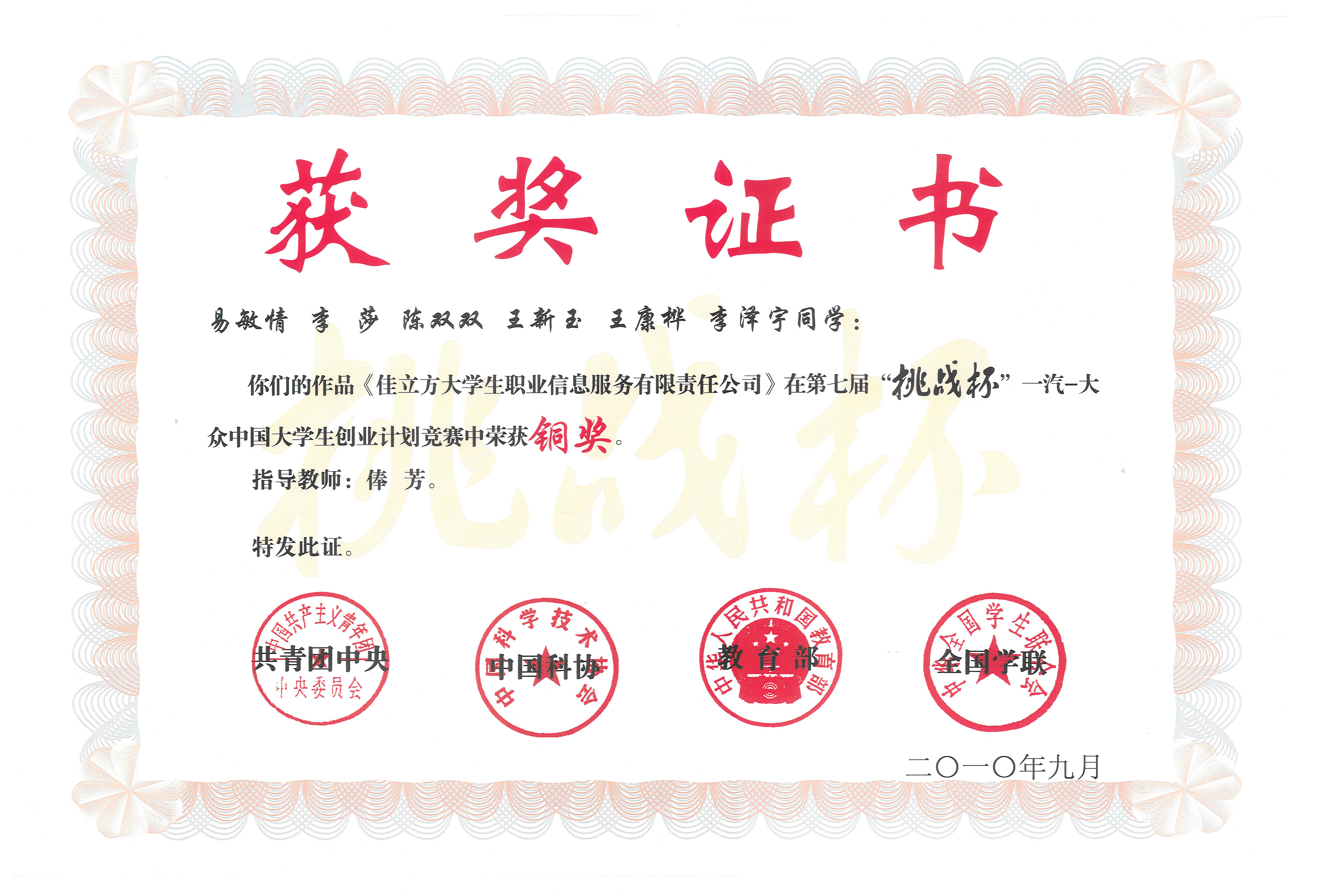 第七届“挑战杯”中国大学生创业计划竞赛获奖证书
