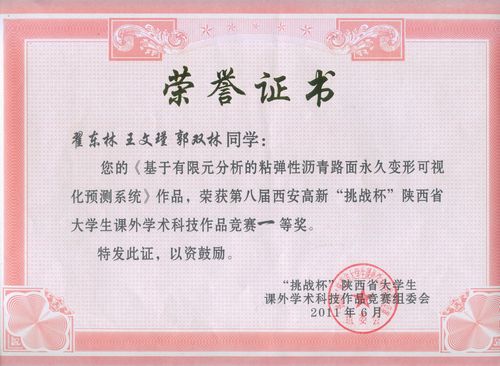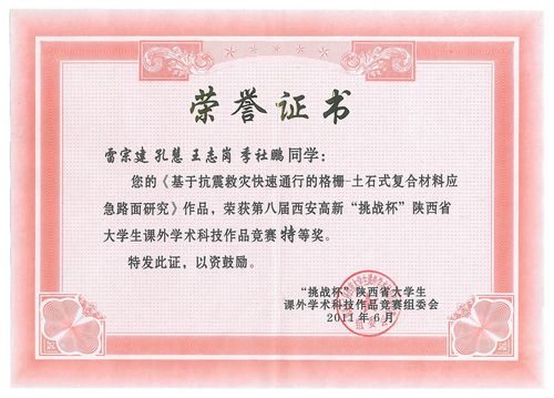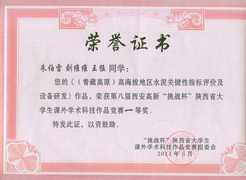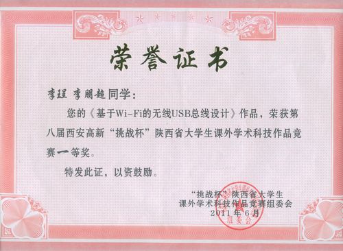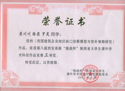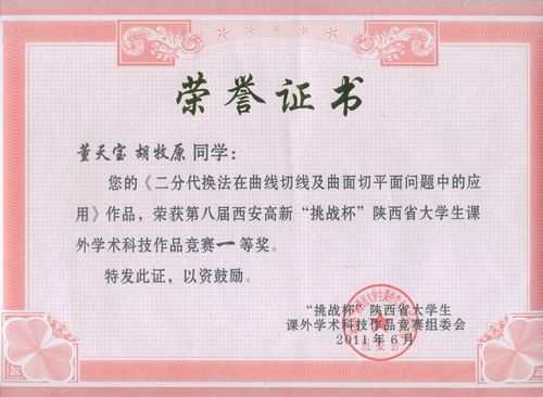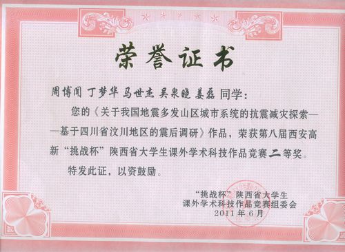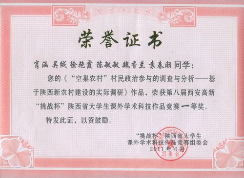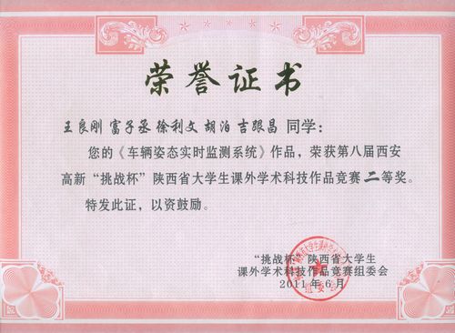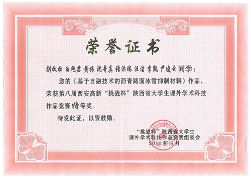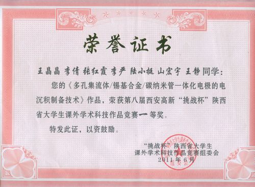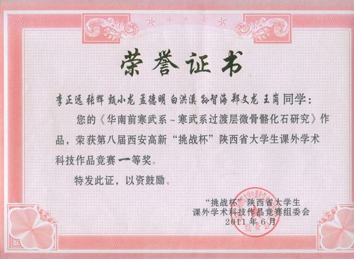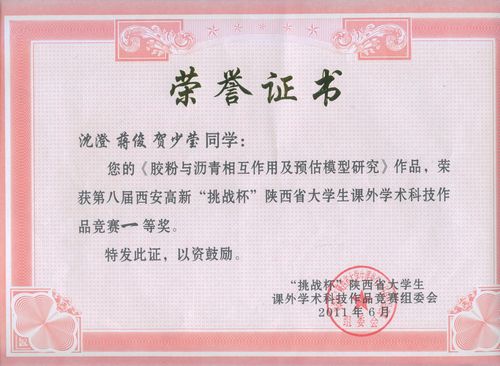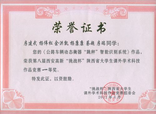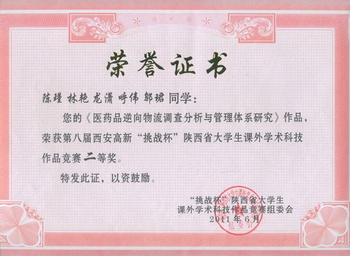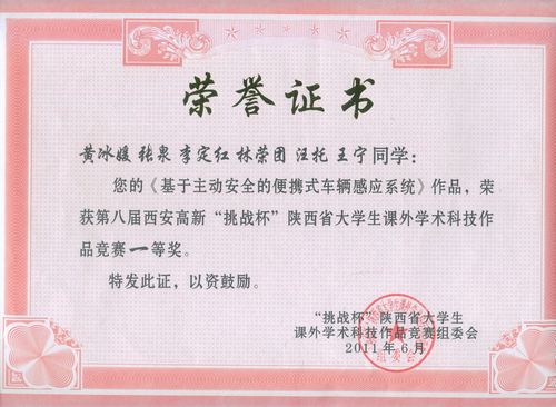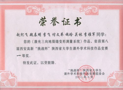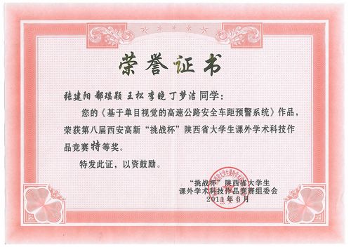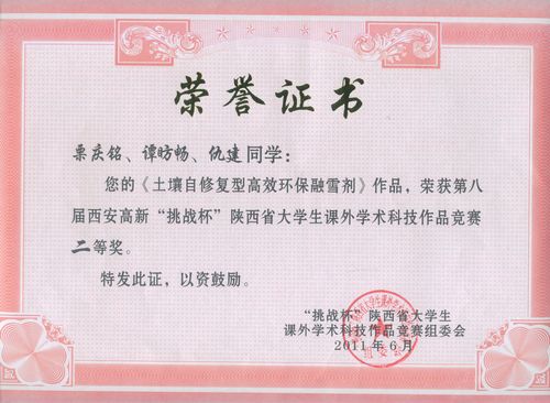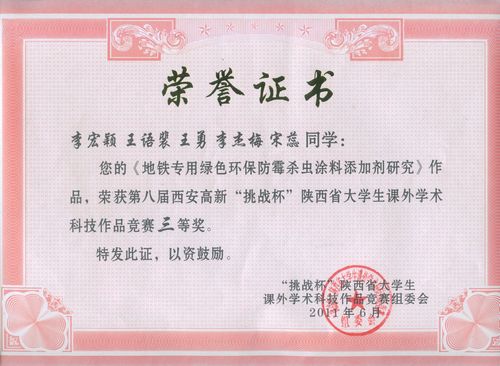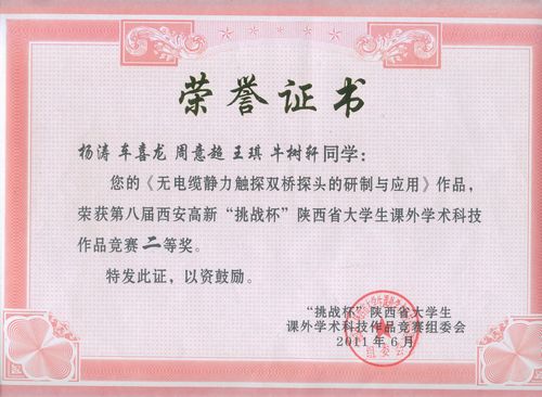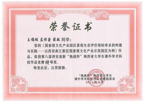 第八届西安高新“挑战杯”陕西省大学生课外学术科技作品竞赛证书