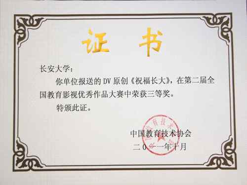 我校报送的DV原创作品《祝福长大》在此次大赛中荣获第二届全国教育影视优秀作品大赛三等奖。