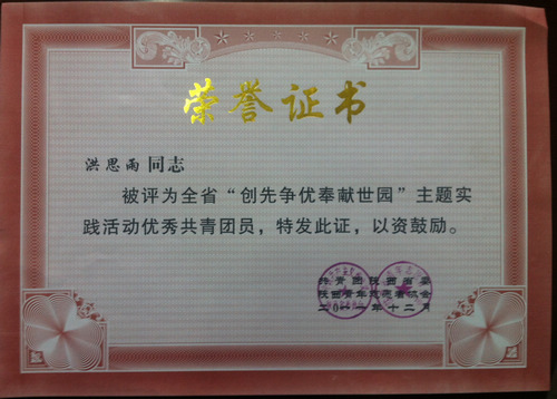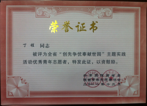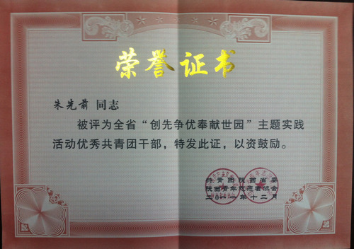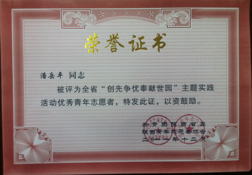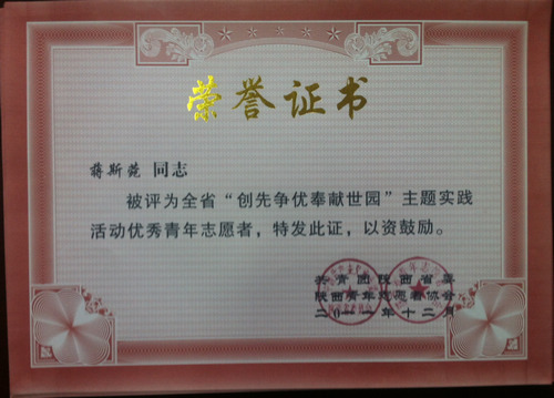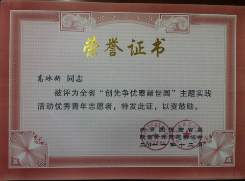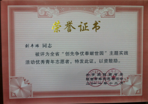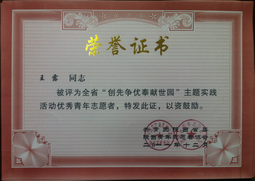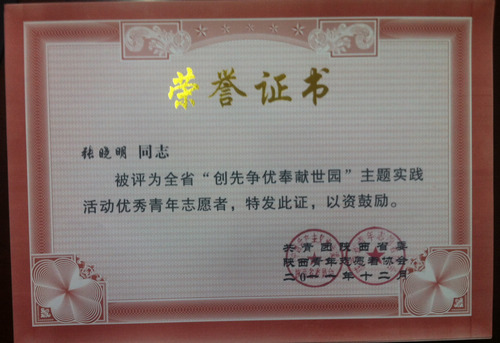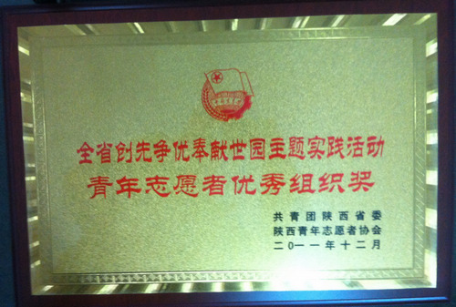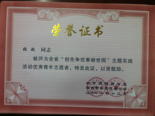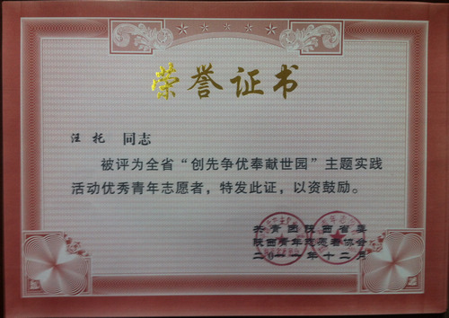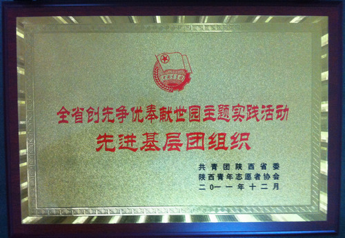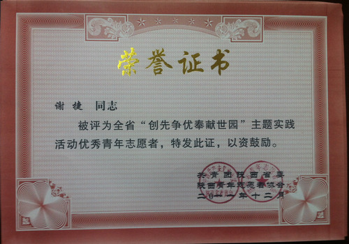 陕西省“创先争优 奉献世园”主题实践活动获奖证书