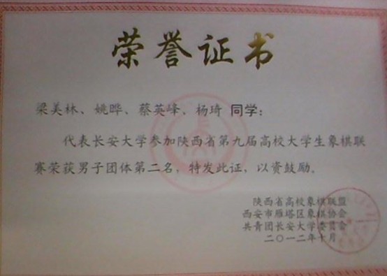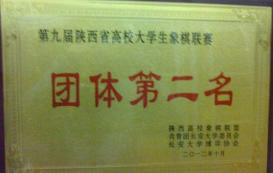 陕西省第九届高校中国象棋联赛是于10月27至28日在长安大学渭水校区由陕西省高校棋类联盟主办、共青团长安大学委员会、长安大学社联、长安大学博弈协会承办、西安市象棋协会协办的。此次比赛有来自陕西省的37支高校队伍,共计170余人参加。经过两天的激烈角逐,评比出了各奖项。我校参赛队伍也获得团体二等奖的有史以来最好成绩。获奖名单公布如下:
