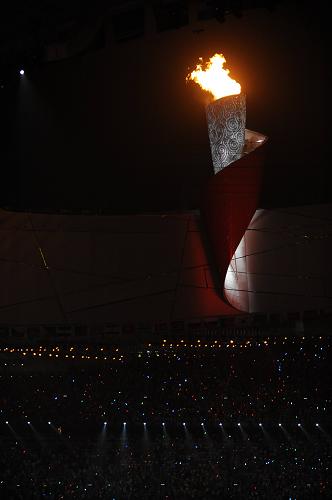 李宁轻轻地将火炬伸向前方,在光影打出的一只金色凤凰前点燃了引线。一道火苗旋转上升,奔向火炬塔,“忽”地一声,矗立在鸟巢边缘的主火炬喷出熊熊火光,照亮北京的夜空。