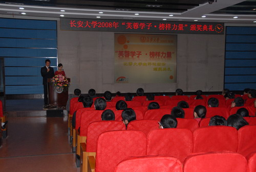 11月21日下午,2008年“芙蓉学子•榜样力量”优秀大学生评选活动颁奖典礼在渭水校区会议中心报告厅隆重举行。校党委副书记白华应邀出席颁奖典礼,团省委学校部副部长单舒平应邀出席并讲话。党委办公室秘书史少鹏、宣传部部长黎开谊、学工部部长田新民、校团委副书记张骞文、张侠,教务处副处长马恒升、渭水校区管委会办公室副主任王振山以及部分学院党委副书记、团委(团总支)书记、“芙蓉学子•榜样力量”各奖项候选人和各院系学生代表参加颁奖典礼。