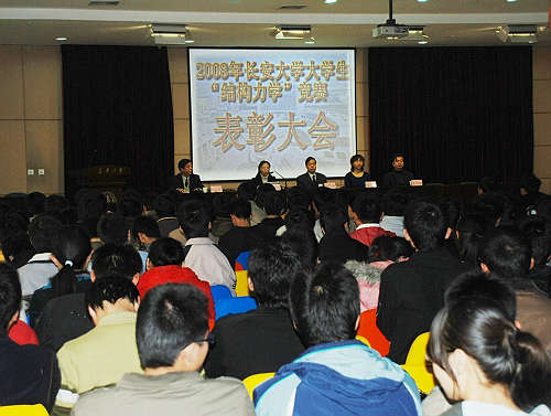 12月12日下午2时,2008年长安大学大学生“结构力学竞赛”表彰大会在渭水校区大学生活动中心多功能厅举行。出席表彰大会的有长安大学副校长赵均海教授、校团委副书记张侠、建工学院副院长袁卫宁、党委副书记刘世良、建工系副主任王步、结构教研室刘鸣、刘青、李悦老师,以及建工学院学工办主任李险峰、团委书记王树莹和辅导员老师、学生300余人参加表彰大会。大会由建工学院党委副书记刘世良主持。