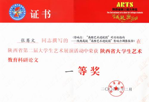 在本届艺术展演活动中,我校荣获了“优秀组织奖”和“精神风貌奖”, 校团委副书记张骞文的论文《影响力:“高雅艺术进校园”的目标指向——陕西高校“高雅艺术进校园”影响力调查报告》和大学生艺术团指导教师潘迎的论文《理工科院校大学生艺术教育的现状调查》获艺术教育科研论文一等奖;合唱作品《再见吧,母校》荣获声乐(甲组)一等奖,群舞《依娜麦达》荣获舞蹈(甲组)二等奖,戏剧《外联也美丽》荣获戏剧小品(甲组)二等奖;DV作品《留守的天空》和《蹒跚夕阳》荣获艺术作品类二等奖,绘画《水彩风景》、《钢笔画写生》和国画《何处为家》荣获艺术类作品三等奖;我校张艺凡、张侠、周文宁、陈晏老师荣获“优秀指导教师”称号。