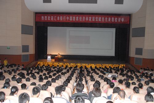 4月19日下午6:30,应我校邀请,汇丰银行中国首席经济学家屈宏斌先生在朝晖大学生活动中心活动中心大礼堂为广大师生作了一场题为《全球金融危机及中国对策》的学术报告。校团委、渭水校区部分学院负责人出席报告会。各院系团委书记、我校青年马克思主义者培养学校第二期学生骨干培训班成员及部分院系同学共计1000人聆听了此次报告。